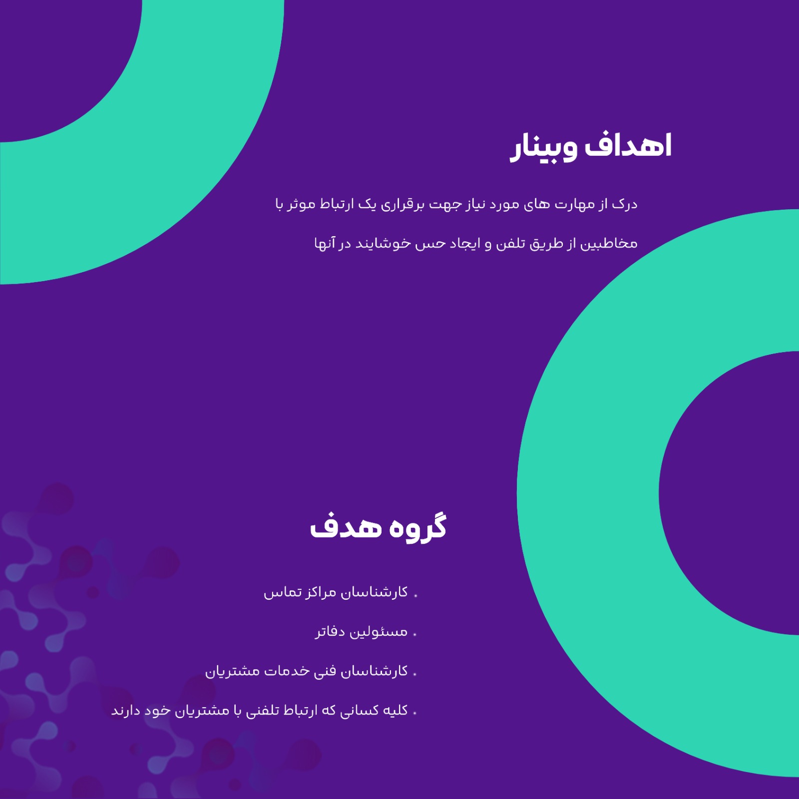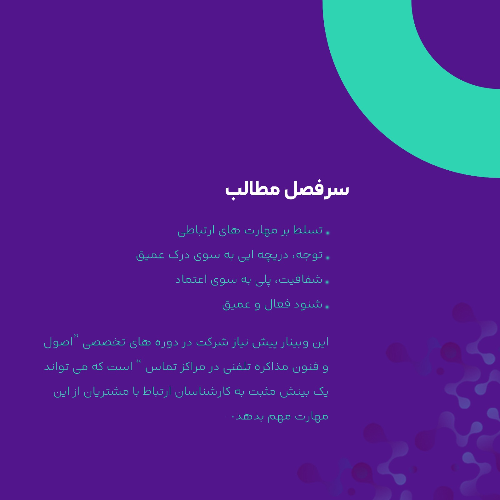 این وبینار پیش نیاز شرکت در دوره های تخصصی “اصول و فنون مذاکره تلفنی در مراکز تماس ” است که می تواند یک بینش مثبت به کارشناسان ارتباط با مشتریان از این مهارت مهم بدهد.